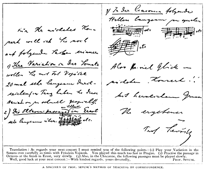 I was shown a letter from Sevcik; curious – as it showed his manner of giving his pupil violin lessons by post.