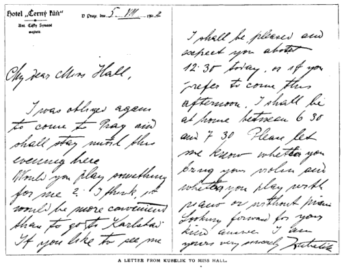 “I found Kubelik and his accompanist at breakfast. I do not think they expected me; they seemed to think I was amusing, especially when I asked Kubelik to accompany me.”