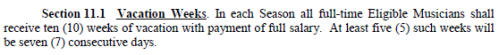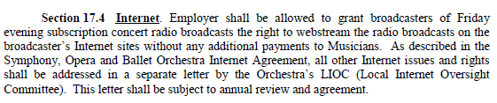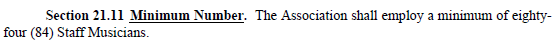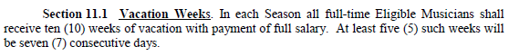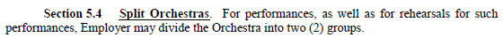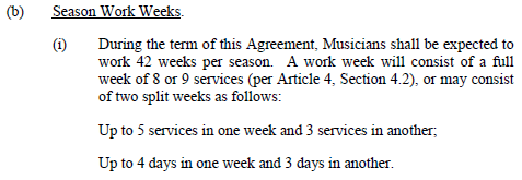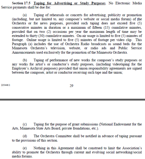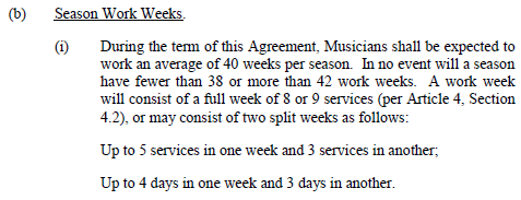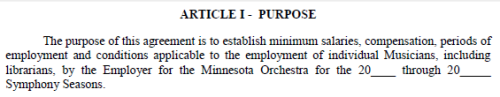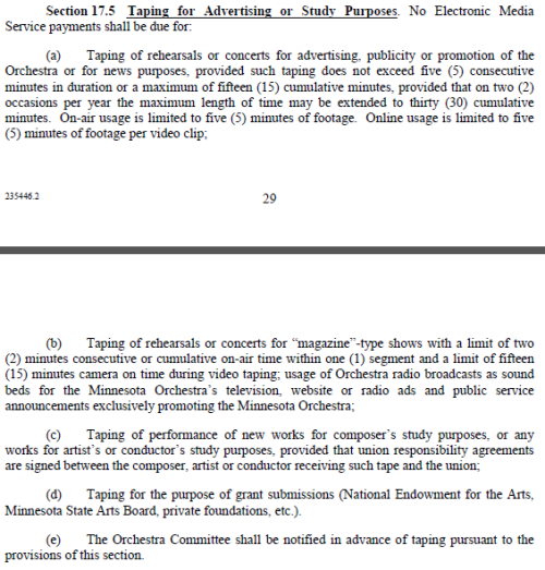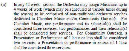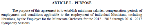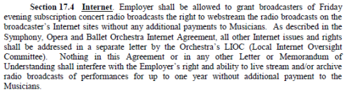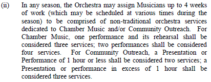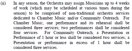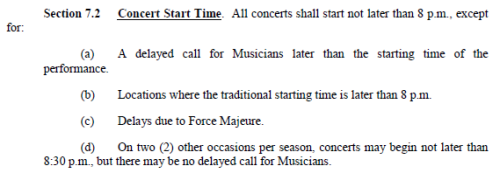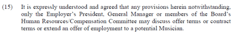 Obfuscation #6. If, after the books were opened, and the proposed changes were fair and warranted, chances are, an arbitrator would impose significant participation onto musicians, and the musicians were willing to take that very real risk. Salary is a secondary sticking point in this battle. I’m going to go out on a limb here and say that if we were discussing just salary and not contract changes, we might have settled this dispute many months ago. No, this battle is about a number of non-financial contract changes or nominally-financial contract changes that “give management more flexibility” but actually have the unfortunate consequence of allowing businessmen to make vital artistic decisions. A reader who has studied the contract more carefully than I have recently pointed out this little gem to me. It’s Section 23.3, (15), about Audition Committee. It’s on page 39 here.