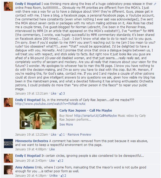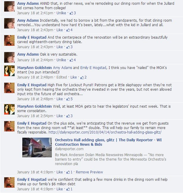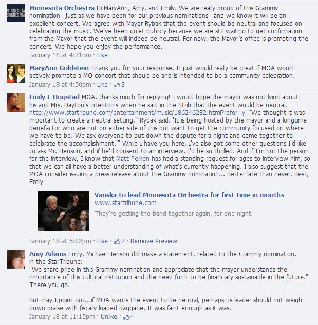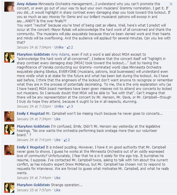 Also, you may be interested to know that the Minnesota Orchestral Association has deleted most of the posts on their Facebook wall. Yup, just about everything from post-September has disappeared for the moment. I’m assuming this is censorship rather than a technical hiccup, because it begins at a very specific date.