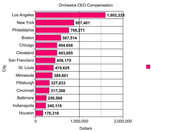 Some readers have asked me how Mr. Henson’s salary compares to musicians’. We’ve heard nothing about Mr. Henson taking a substantial cut in compensation, so I’m assuming he is planning on taking home roughly $389,861 in the years to come. In the following graph, I use base salary to represent the musicians. Remember it is impossible to know what their average compensation is, since only a handful of musicians are represented on the 990. This comparison between total compensation and base salary is obviously problematic, but I feel it is better than nothing.