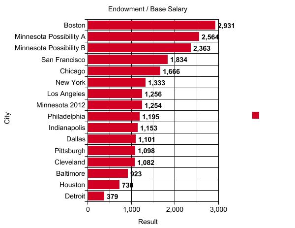 - “Minnesota Possibility A” is a $200 million endowment and $78,000 base salary (as posited in the “Dorky Musings” essay). “Minnesota Possibility B” is a $260 million endowment and a $110,000 base salary (as posited in this new “Balancing the Scales” email).