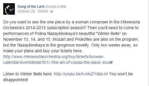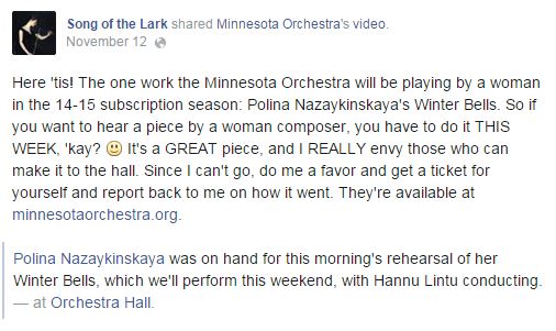 The concert began with Polina Nazaykinskaya’s Winter Bells. Nazaykinskaya is the only woman composer in the Minnesota Orchestra’s sizable 2014-2015 subscription season, and also my Facebook followers are tired of hearing me complain about this.