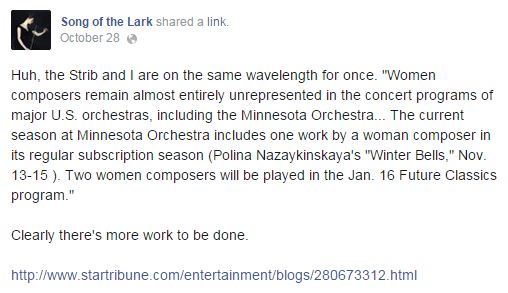 “Yep, Emily, we get the message, the lack of women composers is hugely unfortunate and a downside of an otherwise brilliant 14-15 season. Agreed.”