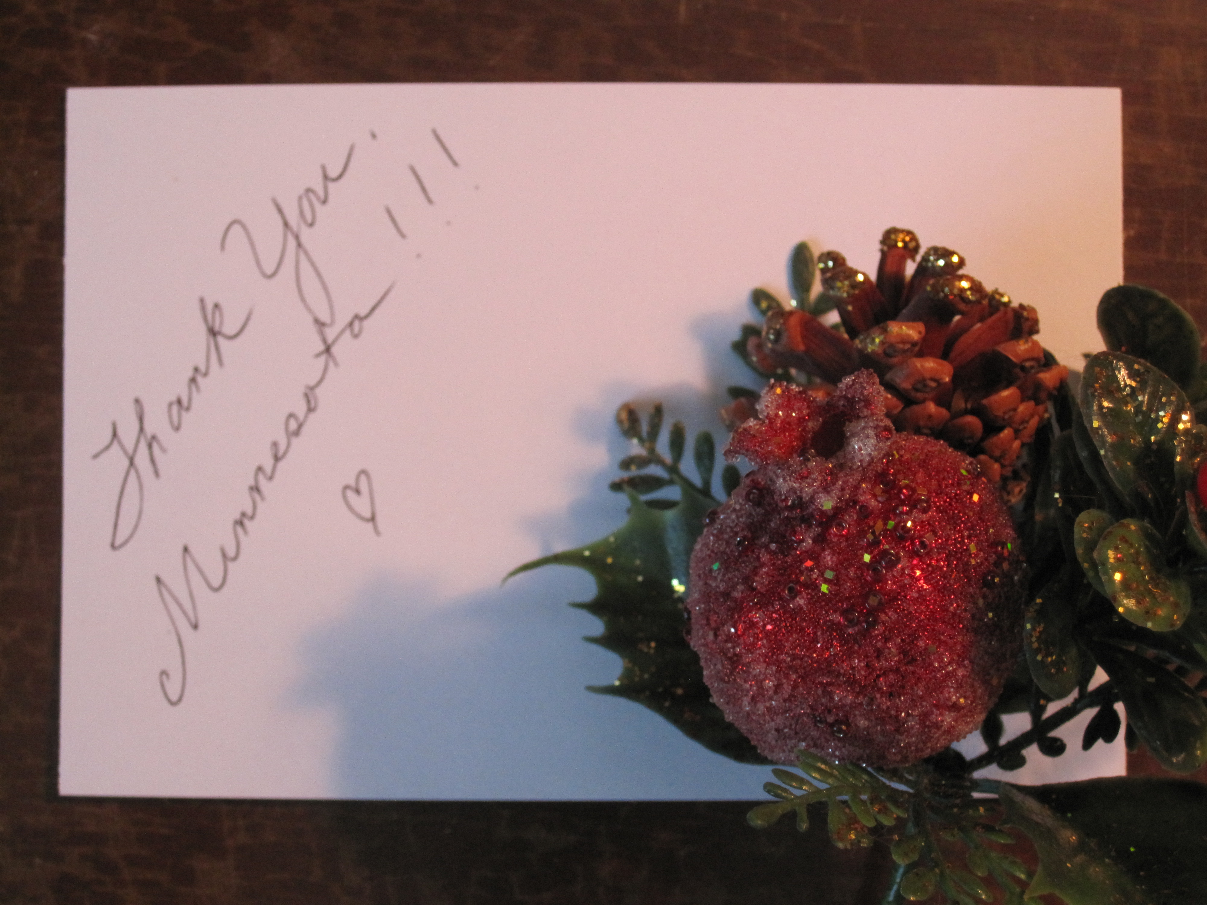 The Minnesota Orchestra posted an adorable picture on their Facebook page of musicians holding up signs of gratitude. Mine isn’t nearly as wonderful, but I did just sit down at my desk, scribble my own handwritten sentiments on a notecard, and place a sprig of holiday sparkle next to it.