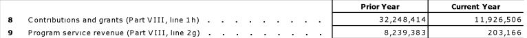 Contributions and grants went from $32.2 million to $11.9 million. (True, the hall fundraising campaign was still going great guns in the prior year and was slowing down in the current year, but still.) I wish I could see a breakdown of where all that money came and went from.