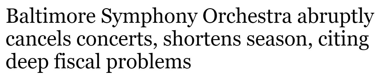 This non-profit is the Baltimore Symphony in the year two-thousand-and-nineteen AD. April twenty-four: management announces a summer season of concerts. May twenty-five: the state government approves $3.2 million to carry the organization through financial trouble. May thirty: the organization’s leadership burns every bridge, to every stakeholder, for reasons yet unknown and unknowable.